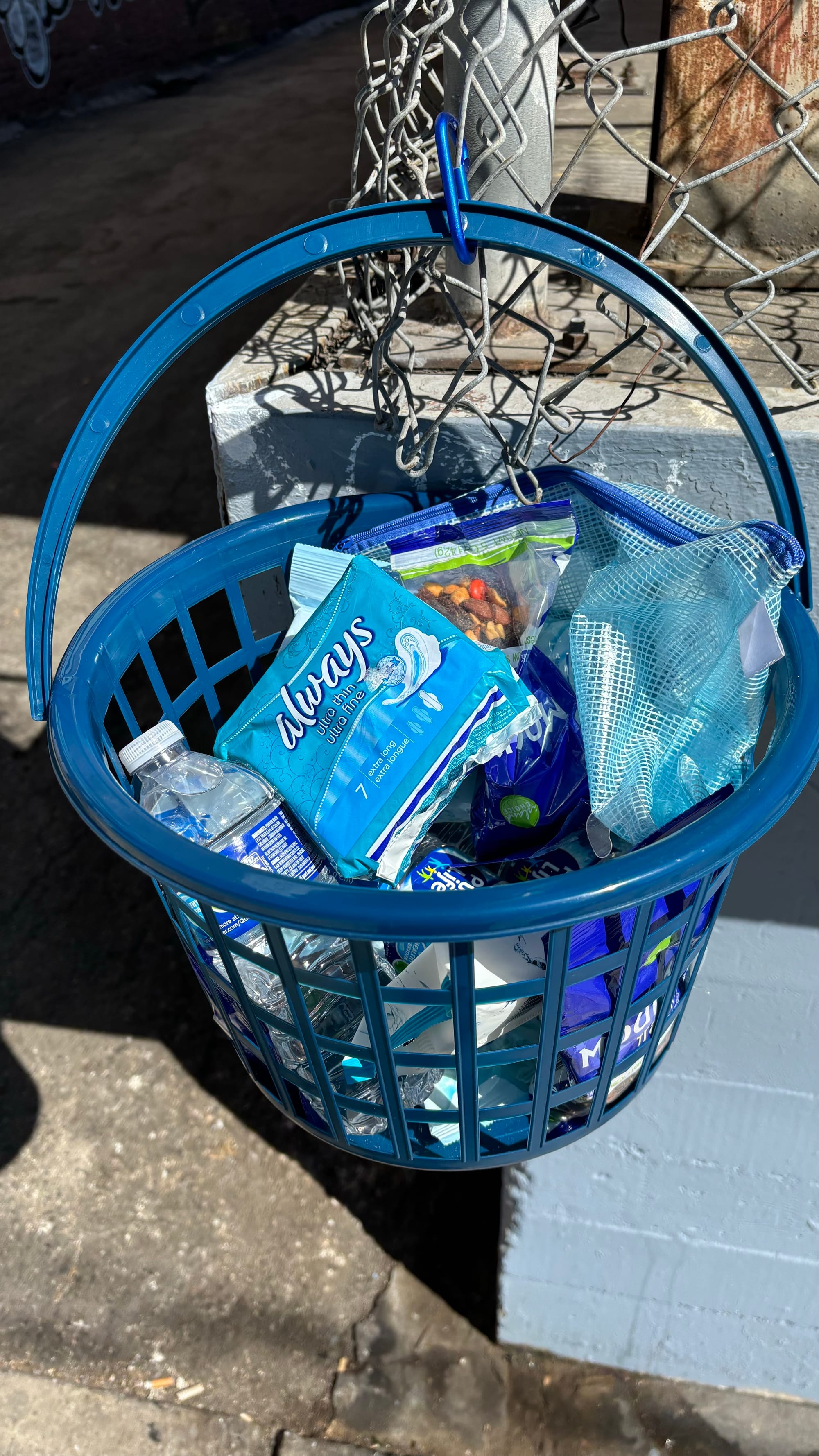Water bottles, snack mixes, personal wipes, feminine pads, tooth brushes and other personal care items in plastic basket with carabiner.